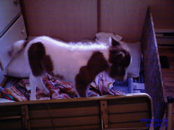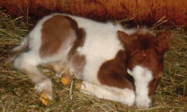 On June 11, 2006, Romance presented us with a beautiful pinto filly. Unfortunately, Romance would not feed her filly so we brought Sundae home and bottle fed her.